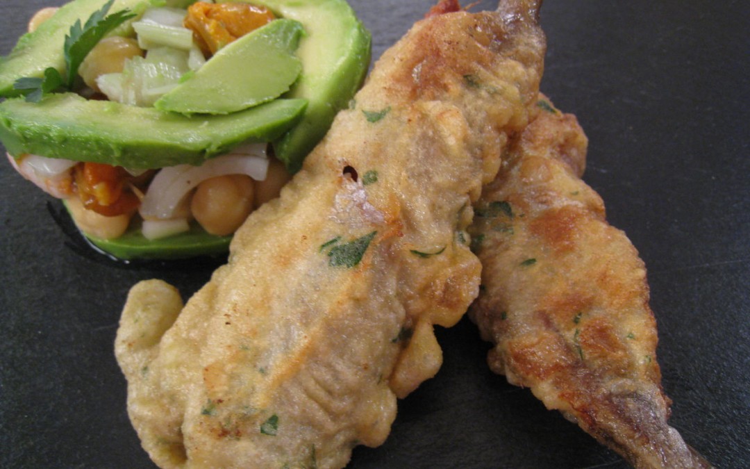 • Para la masa de rebozar el pescado, picaremos ajo y perejil en un cuenco. Agregar el huevo y medio vaso de agua. Mezclar bien e ir agregando harina poco a poco hasta conseguir una textura de crema suave. Salar un poco, pasar el pescado por esta masa y freír en aceite caliente. Apartar sobre papel de cocina para que escurran.