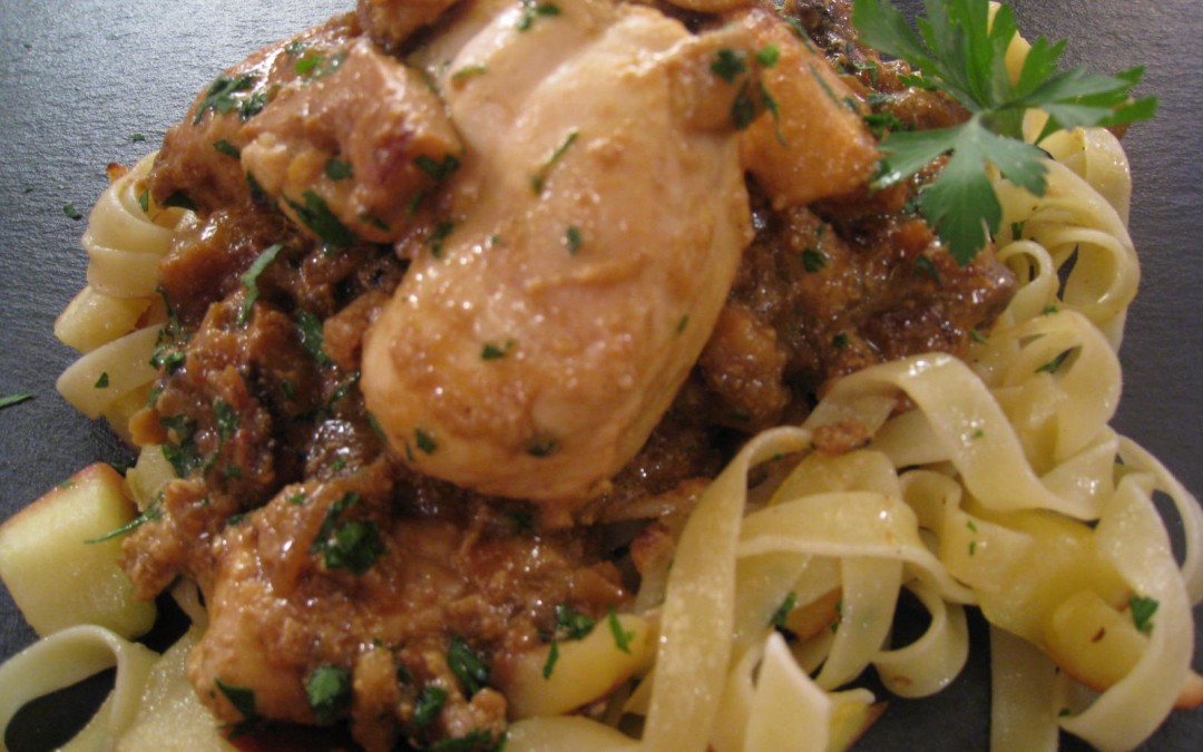 • Verter la leche sobre las verduras, devolver la carne de pollo a la cacerola y cocer hasta que la salsa tenga cuerpo y haya espesado.