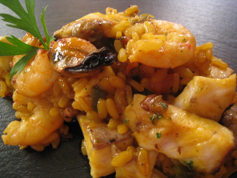 - Agregar los cuerpos de los langostinos, de los mejillones, de las almejas y los dados de corvina. Mezclar bien, disponer picada por encima de la paella y llevar al horno, a máxima temperatura, durante 7 minutos.