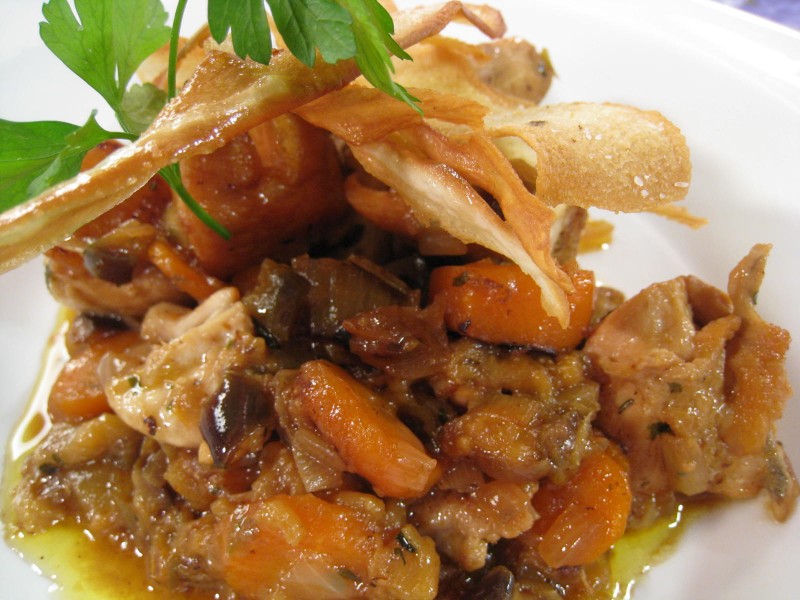 - Trocear el pollo, salpimentarlo y dorarlo al fuego con un poco de aceite de oliva virgen extra.