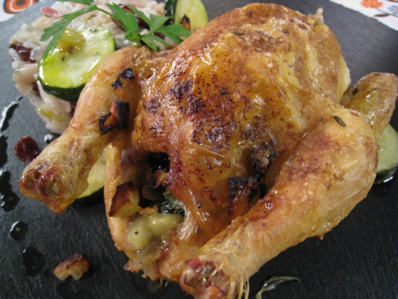 – Cortar un calabacín en rodajas, extenderlo sobre la placa de horno engrasada con aceite y salpimentarlo. Disponer encima de estas rodajas los pollos picantotes y rellenarlos con el salteado de manzana y espinacas. Salpimentar, exprimir el zumo de 1 limón por encima, regar con un poco de aceite de oliva virgen extra, unas ramas de tomillo y llevar al horno precalentado a 200º C durante unos 20 minutos aproximadamente.