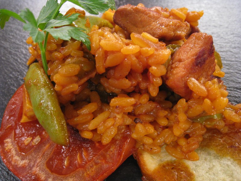 – Cortar el tomate restante en rodajas gruesas y repartir sobre el arroz junto con las judías verdes troceadas y las rodajas de patata. Salpimentar por encima y llevar al horno a 230º durante unos 15-20 minutos.