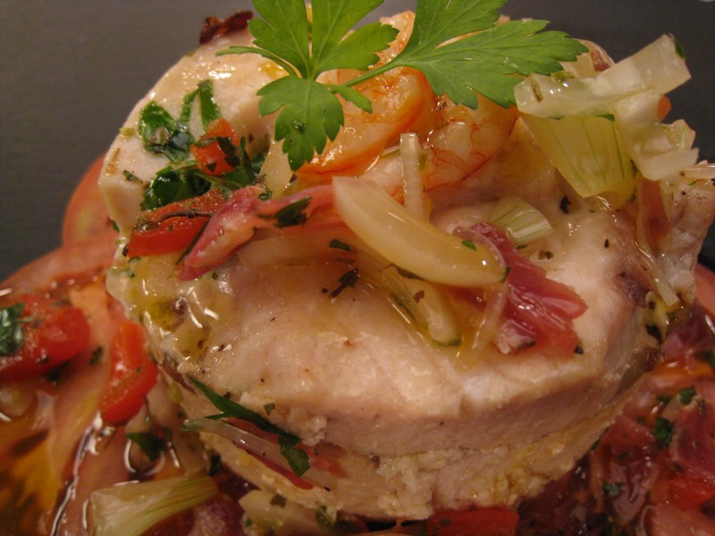 – Lavar y cortar los tomates en finas rodajas. Extenderlas en el plato, disponer sobre éstas el pez espada cocinado en el horno. Retirar el molde con cuidado y aliñar todo con un poco de vinagreta.