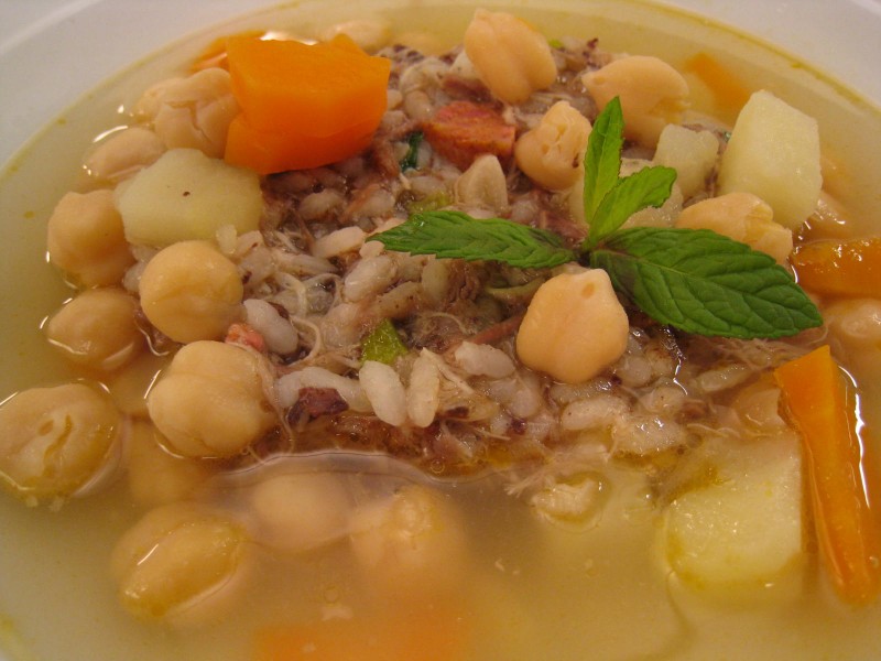 • – Una vez que comience a hervir, bajamos la intensidad para que hierva suave. Agregar entonces los garbanzos que hemos tenido la víspera en remojo. Y vamos desespumando constantemente. Cocinar a fuego suave hasta que los garbanzos y la carne estén tiernas.