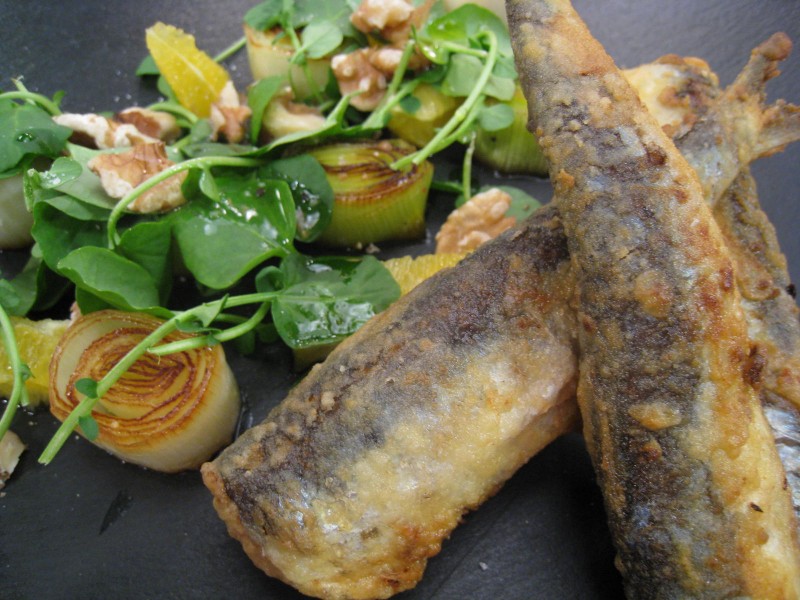 - – Escurrir las sardinas del escabeche, salar y enharinar. Freír en aceite de oliva bien caliente hasta dorar. Apartar sobre papel de cocina para escurrir.
