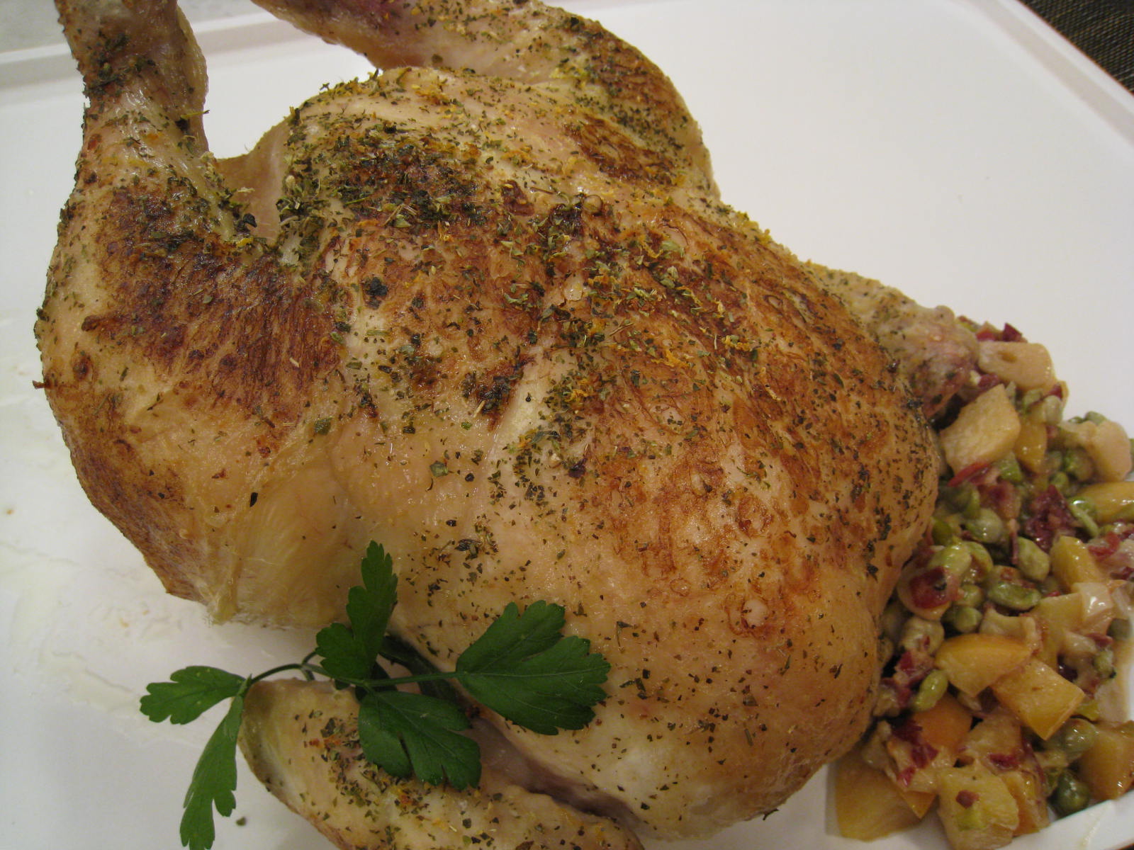 PROCESO COCINA: Bridar el pollo para que mantenga bien la forma al asarlo. Salpimentarlo y dorarlo en una sartén con un poco de aceite de oliva virgen extra. Apartar en una fuente de horno. Agregar 6 dientes de ajo, enteros y golpeados, 2 hojas de laurel, la ralladura de 1 limón y espolvorear con orégano. Verter la leche, cubrir con aluminio y llevar al horno precalentado a 190º C. durante 20 minutos. Desgranar las habas. Retirar el aluminio al pollo que tenemos en el horno y dejar que se ase los últimos 25 minutos. Picar la cebolleta y comenzar a rehogarla con 2 dientes de ajo fileteados. Agregar el jamón picado, las habas y cocinar brevemente. Incorporar una manzana troceada con piel, exprimir un poco de jugo del limón que hemos rallado y cubrir con agua. Dejaremos hervir a fuego fuerte unos 10 minutos hasta que evapore el agua. Sacar el pollo del horno. Colar el jugo del asado, vertemos un poco sobre las habas y el resto lo ponemos en un cazo a reducir al fuego.
