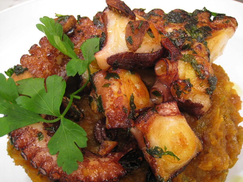PROCESO COCINA: Disponer una cebolla entera cortada en cuartos, un puñadito de sal y un chorreón de aceite de oliva virgen extra en agua hirviendo. Lavar el pulpo bajo el grifo, retirar la boca e introducirlo de forma muy breve tres veces seguidas en el agua hirviendo. Finalmente lo dejamos dentro para que cueza durante unos 20-30 minutos. Por otro lado, para las patatas picaremos la otra cebolla y el pimiento verde en pequeños dados. Comenzaremos a rehogarlos con un poco de aceite de oliva virgen extra. Añadiremos las patatas peladas, lavadas, secadas y cortadas en cachelos, junto con una hoja de laurel. Rehogaremos brevemente y cubriremos solo con el agua necesaria de cocción del pulpo. Dejaremos cocer a fuego medio alto hasta que la patata comience a estar tierna y se haya evaporado casi toda el agua. Añadir a las patatas una cucharada de pimentón, una pizca de comino y sal. Remover bien y reservar para el emplatado. Retirar el pulpo del agua, dejar que pierda un poco de temperatura y comenzar a trocearlo. Filetear 5 dientes de ajo y comenzar a dorarlos en aceite de oliva virgen extra. Agregar una guindilla cayena y los trozos de pulpo. Saltear a fuego fuerte, echar un poco de sal y abundante perejil picado.