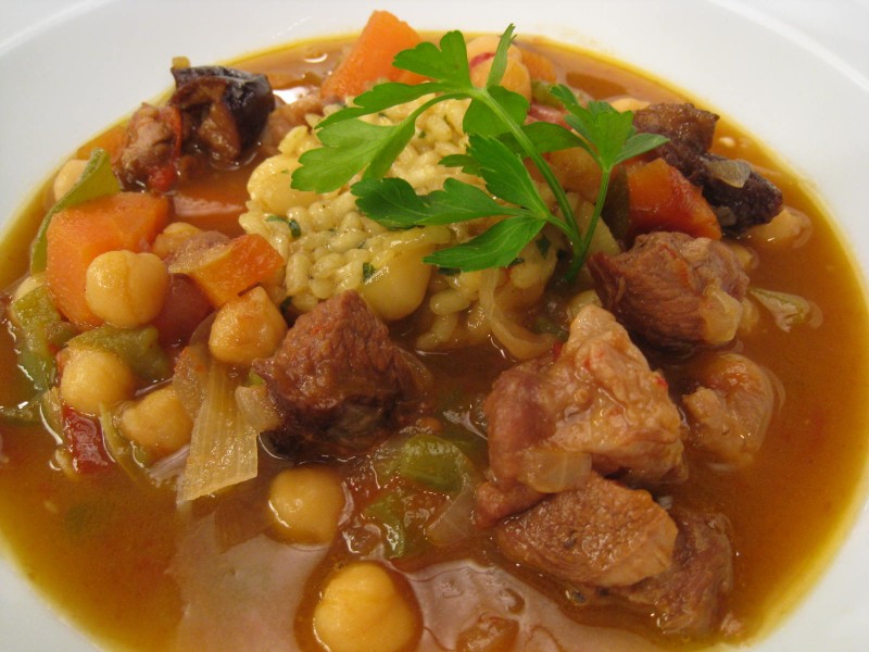 PROCESO COCINA: Poner a cocer los garbanzos, que hemos tenido la víspera en remojo, en agua hirviendo con 2 hojas de laurel, 1 puerro, 1 zanahoria y 2 pimientos choriceros. Cuando estén tiernos, retirar la cacerola del fuego. Sumergir las ciruelas en el vino dulce y dejarlas en la nevera 1 día. Salpimentar el cordero y dorarlo en aceite de oliva virgen extra. Agregar la cebolla, 3 ajos, el resto de zanahorias y los pimientos verdes; todo troceado al gusto. Sofreír e incorporar los tomates cortados en daditos. Salpimentar y cocinar unos minutos. Incorporar las ciruelas partidas a la mitad y el vino dulce. Dejar hervir y cubrir con agua de cocción de los garbanzos. Dejaremos cocer hasta que la carne esté bien tierna y no tenga mucho líquido. Agregar entonces los garbanzos y cocinar 15 minutos a fuego medio-fuerte. Como guarnición, doraremos las almendras troceadas con 2 dientes de ajo fileteados. Añadiremos el arroz y cubriremos con el doble de caldo de los garbanzos. Echar sal, pimienta, perejil picado y curry. Cocinar hasta que evapore el líquido y el arroz esté cocido.