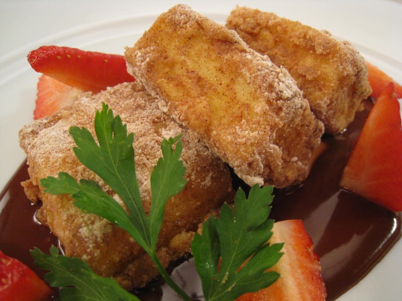 PROCESO COCINA: Para la leche frita: Poner a hervir 1 litro de leche, 1 rama de canela y las cáscaras de medio limón y media naranja. Mientras tanto mezclar en un cuenco 4 huevos, 200 gr. de azúcar y 150 gr. de fécula de maíz. Cuando la leche comience a hervir, la colamos sobre el bol anterior, mezclar y devolver al mismo recipiente donde hemos calentado la leche. Remover constantemente hasta que hierva. Cubrir la base de un molde con plástico film y verter la masa de leche frita sobre ésta. Cubrir con plástico y dejar enfriar, primero a temperatura ambiente y, más tarde, en la nevera. Para la salsa de chocolate comenzaremos a calentar la nata, medio vaso de agua y una cucharada sopera de azúcar en un cazo al fuego. Nada más que hierva bien, lo retiramos y agregamos el chocolate troceado, poco a poco, hasta obtener una salsa cremosa y brillante. Desmoldar la leche frita bien enfriada y cortarla en porciones. Pasar por harina, huevo batido y freír en aceite de oliva virgen extra. Apartar sobre papel para escurrir y rebozar con azúcar glasé y canela en polvo.