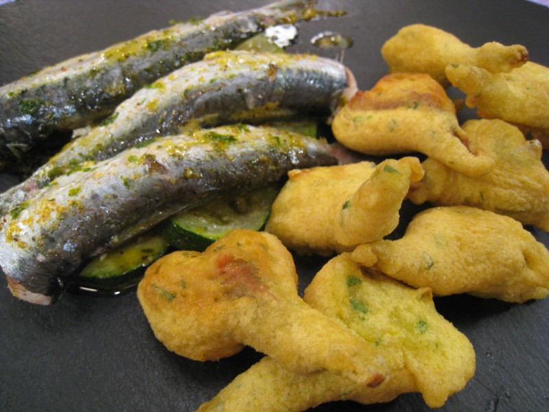 PROCESO COCINA: Limpiar las sardinas, quitándoles el exceso de escamas, la cabeza y las tripas. Abrirlas y retirar la espina central. Lavarlas en agua y reservar. Cortar el calabacín en rodajas, salpimentar y dorar en una sartén con muy poco aceite de oliva virgen extra. Disponer las rodajas de calabacín en una placa de horno, formando 4 grupos. Colocar sobre estas las sardinas con el lado de las escamas hacia abajo. Reservar. Disponer al fuego una cacerola con agua, una par de cucharadas soperas de harina, sal y un limón exprimido. Limpiar los alcauciles, retirando las hojas externas y el tallo, y sacar solo los corazones. Introducirlos en el agua que tenemos al fuego y dejar cocer hasta que estén tiernos. Cuando los alcauciles estén cocidos, retirarlos del fuego, sacarlos del agua y dejarlos atemperar y escurrir sobre papel de cocina. Mientras tanto batir la yema del huevo en un bol, añadir 1 vaso de agua, unas hojas de perejil fresco recién picado y un poco de colorante. Iremos agregando la harina poco a poco, moviendo bien para que se vaya integrando. Tenemos que obtener la consistencia de una crema espesa y sin grumos. Echar una cucharadita de levadura y ajustar de sal. Batir la clara del huevo a punto de nieve y mezclarla con la masa con movimientos envolventes. Batir en una jarra un buen manojo de perejil, 1 diente de ajo, 1 copita de manzanilla, una pizca de pimentón, un poco de orégano, sal, pimienta y un chorrito de aceite de oliva virgen extra. Cubrir las sardinas con esta mezcla y llevar al horno precalentado a 200º C. durante 3 minutos aproximadamente. Cortar los alcauciles en cuartos o mitad, pasarlos por la masa de rebozar y freírlos en aceite de oliva virgen extra.