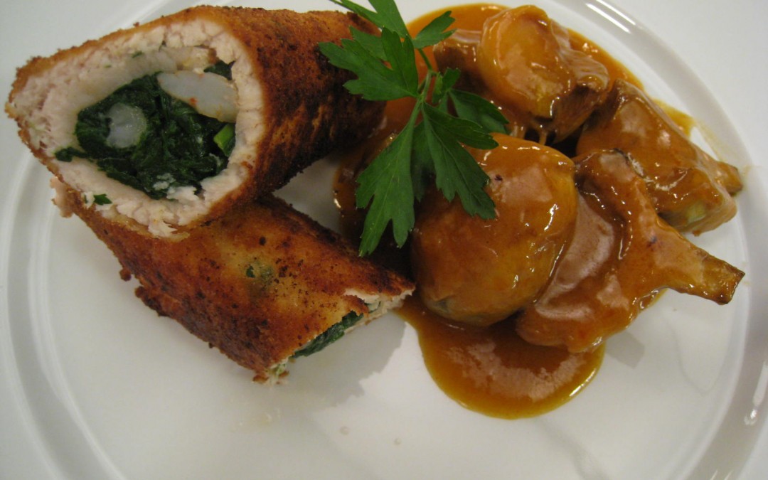 PROCESO COCINA: Disponer los filetes de pez espada en una fuente y echarles por encima una mezcla de perejil picado, sal, pimienta y un chorrito de vino blanco. Dejar marinar media hora al frío. Para el relleno de los flamenquines comenzaremos a dorar 2 dientes de ajo picado y, cuando comiencen a coger color, agregaremos las hojas de espinacas limpias. Agregar una pizca de comino molido, sal, pimienta y retirar del fuego. Agregar los cuerpos de las gambas picados y dejar enfriar en un colador. Limpiar las alcachofas retirando las hojas exteriores. Cortar los corazones a la mitad y disponerlos en un cuenco con agua fría, 1 limón exprimido y un ramillete de perejil. Espalmar los filetes de pez espada. Extenderlos, salpimentar y disponer sobre el pescado un poco de espinacas con gambas. Cerrar el pescado haciendo un rulo. Empanar y reservar. Escurrir las alcachofas, secarlas y comenzar a freírlas en aceite de oliva virgen extra. Apartarlas sobre papel de cocina y en ese mismo aceite agregar 1 cucharada de harina. Remover bien, incorporar media cucharada de pimentón y, antes que se queme, añadir un buen chorreón de vinagre y el resto del vino blanco. Volver a introducir las alcachofas fritas, cubrir con agua y echar 3 dientes de ajo enteros y golpeados, unos granos de pimienta, 3 clavos, 2 hojas de laurel y un puñadito de sal. Tapar parcialmente la sartén y dejar cocinar 30 minutos a fuego medio. Finalmente, freír los flamenquines en aceite de oliva virgen extra.