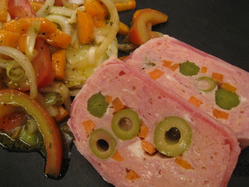 PROCESO COCINA: Disponer en un cuenco la carne de pollo y el jamón cocido picado. Añadir el huevo y las porciones de quesito. Salpimentar y mezclar bien. Cubrir un molde de horno con papel vegetal y forrar con lonchas de bacón. Disponer la mezcla de carne anterior, intercalando 1 zanahoria cortada en bastones, pepinillos y aceitunas sin hueso. Tapar con más bacón y apretar bien para compactar y llevar al horno, precalentado a 180º C. entre 30 y 35 minutos. Como guarnición haremos una ensalada, mezclando en un cuenco 3 partes de aceite de oliva virgen extra con 1 de vinagre, sal y pimienta. Añadiremos 2 zanahorias cortadas en daditos, una cebolleta y 1 tomate picado, una cucharadita de mostaza suave, una pizca de comino, de orégano y, finalmente, un toque muy sutil de miel. Limpiar los cogollos, cortarlos a la mitad y reservarlos cubiertos con un paño o papel húmedo. Sacar la terrina del horno y dejarla que enfríe. Guardándola entonces en la nevera.