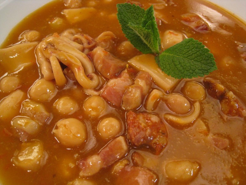 PROCESO COCINA: Poner a cocer los garbanzos, que hemos tenido en remojo de agua tibia la noche anterior, en una cacerola con agua hirviendo. Incorporar una cebolla pelada con dos clavos, 1 pimiento verde y 1 tomate. Agregar los pimientos choricero y una hoja de laurel. Dejar hervir a fuego medio. Mientras tanto freiremos las rebanadas de pan en una sartén con aceite de oliva virgen extra. Las apartaremos y reservaremos. En el mismo aceite anterior rehogaremos la panceta troceada con 1 guindilla cayena y los dientes de ajo laminados. Añadiremos los calamares limpios y troceados. Mantendremos a fuego alto unos minutos, salpimentaremos y verteremos en la cacerola de los garbanzos. Disponer las rebanadas de pan en una jarra con la cebolla sin clavos, el pimiento verde, el tomate y los pimientos choricero que teníamos cociendo. Echar una cucharada de pimentón, ½ de comino y sal. Verter un poco de agua del guiso, triturar y verter sobre los garbanzos. Cortar el chorizo en daditos, saltearlo con poco aceite y añadirlo junto con una ramita de hierbabuena.