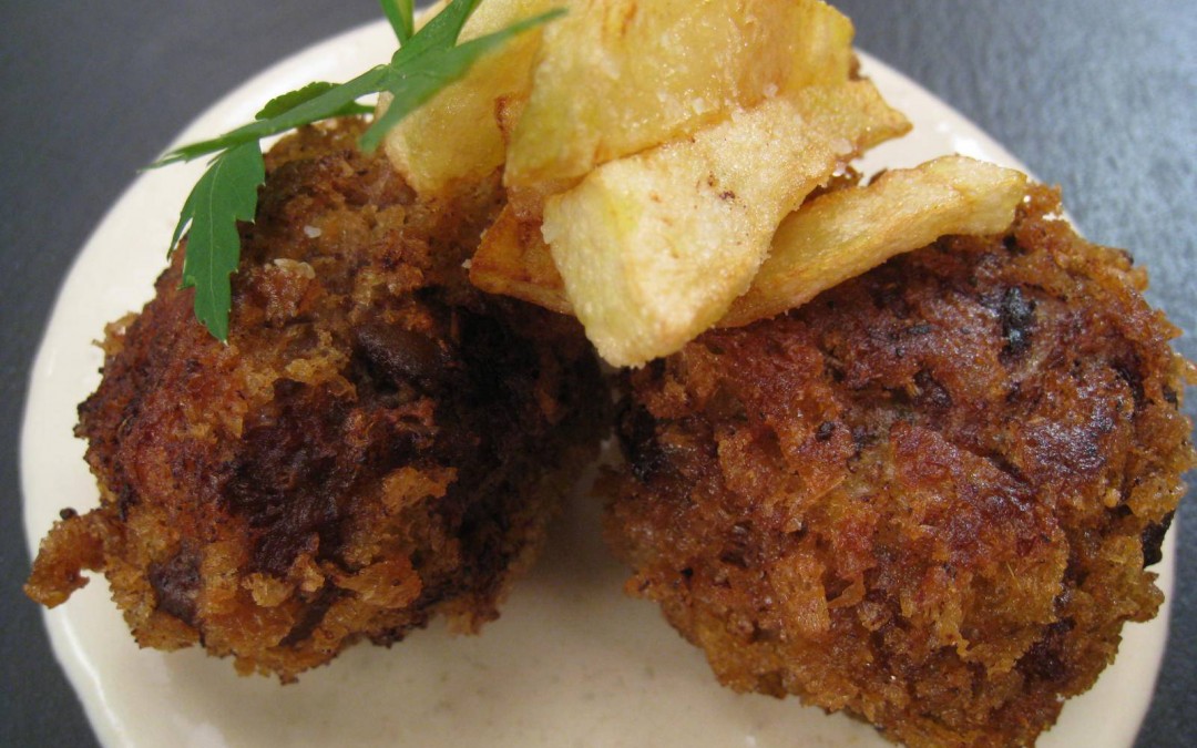 PROCESO COCINA: Picar 1/2 cebolla y 2 dientes de ajo. Comenzar a rehogarlos en aceite de oliva virgen extra con la berenjena pelada y cortada en pequeños dados. Añadir las setas troceadas, cocinar unos minutos y agregar 1 tomate rallado. Dejamos sofreír hasta que se haya evaporado el agua del tomate y apartamos para que enfríe. Para la salsa, picar la otra media cebolla y rehogarla al fuego con un poco de aceite. Agregar el brandy, flambear y verter la nata. Dejar hervir, agregar el caldo de carne, media cucharadita de curry, algunos trocitos de pan y cocinar a fuego suave 10 minutos. Picar mucho el pan con el cuchillo. Triturar la salsa y probar de sal. Disponer en un cuenco las verduras rehogadas frías. Agregar la carne de cordero también picada a cuchillo, las pasas y 1 huevo. Agregar un poco de perejil picado, salpimentar y mezclar bien. Hacer bolas con la masa e introducir un dadito de queso en el interior. Pasar entonces las albóndigas por huevo batido y el pan que hemos picado. Dorarlas en una sartén con aceite de oliva virgen extra y apartar sobre papel de cocina. Como guarnición serviremos con unas deliciosas y sencillas patatas fritas.
