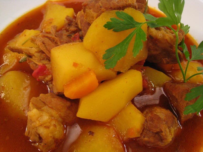 PROCESO COCINA: Antes de comenzar, disponer las ñoras limpias en una jarra con 1 vaso de vino blanco, la copita de Brandy, una cucharada de mostaza suave. Dejamos reposar para utilizarlo más adelante. Comenzar a dorar en una cacerola con aceite de oliva virgen extra los dientes de ajo laminados. Agregar el pimiento rojo y la cebolla troceados. Rehogar bien y, a continuación, añadiremos la carne cortada en pequeños dados. Salpimentar, aliñar con tomillo seco, ramas de romero, 2 hojas de laurel y algunos granos de pimienta. Cocinaremos unos minutos. Agregar los tomates y dejar sofreír unos minutos. Mientras tanto trituraremos el contenido de la jarra que teníamos reposando. Verterlo sobre la caldereta junto con 1 litro de caldo de carne. Dejamos hervir a fuego medio. Cuando la carne esté tierna, agregaremos las zanahorias y las patatas troceadas, junto con un poquito de colorante. Dejaremos cocer hasta que la patata esté tierna, dejando un par de minutos de reposo antes de servir.