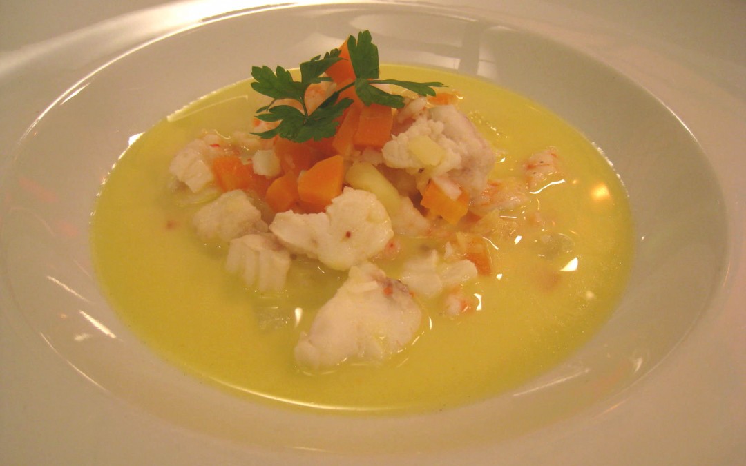 PROCESO COCINA: Para el caldo de pescado, disponer las cáscaras de los langostinos en una cacerola con aceite de oliva virgen extra. Tostarlas y cubrir con abundante agua, 2 hojas de laurel, 1 cebolla cortada a la mitad y un puñado de sal. Limpiar la merluza y agregar la espina al caldo de pescado, que dejaremos hervir 30 minutos a fuego suave; desespumando cuando sea necesario. Mientras tanto aprovecharemos para retirar la piel y trocear el pescado. Pelar las zanahorias y las patatas, cortarlas en pequeños dados y disponerlos en otra cacerola. Cubrir con un poco del caldo de pescado para que se cuezan. Haremos una mayonesa de leche disponiendo en una jarra 2 dedos de leche y una pizca de sal. Comenzaremos a batir suavemente e incorporando aceite de oliva virgen extra poco a poco, hasta obtener una textura cremosa. Una vez que la zanahoria y la patata estén tiernas, añadiremos a la cacerola la merluza troceada y los cuerpos de los langostinos cortados en pequeños trozos. Apagar y retirar del calor. Disponer la mayonesa en una sopera donde vayamos a servir, agregar un chorro pequeños de manzanilla y verter el caldo poco a poco. Una vez que hayamos mezclado bien podemos volcar los tropezones de pescado y verduras. Probar de sal y servir.