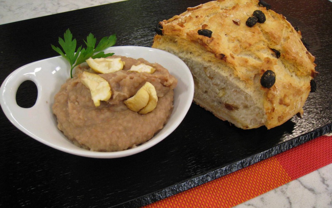 PROCESO COCINA: Para asar las castañas, hacerles unos pequeños cortes, disponerlas en una sartén con un buen pellizco de sal y comenzar a dorarlas a fuego fuerte durante unos minutos; removiéndolas de vez en cuando. Para el pan dispondremos en un cuenco 175 g. de agua tibia, 20 g. de aceite de oliva virgen extra y 15 g. de levadura. Disolveremos bien y añadiremos 310 g. de harina de fuerza y un pellizco de sal . Mezclaremos bien todos los ingredientes hasta que la masa sea homogénea. Terminaremos de amasar ayudándonos con un poco de harina y agregaremos algunas pasas y algunas castañas peladas y troceadas. La masa debe ser elástica y que no se nos pegue en las manos. Engrasar con aceite la base y la tapadera de una fuente de horno. Espolvorear con harina. Disponer encima nuestra masa de pan, darles algunos cortes en la superficie y espolvorear también el pan con un poco de harina. Introducir en el horno frío y apagado. Encender y cocinar a 200º durante 35-40 minutos. Para el paté de castañas comenzar a sofreír en una cacerola con virgen extra la cebolla y el diente de ajo picados. Agregar entonces las castañas asadas y peladas y 1 copita de vino dulce. Acto seguido cubrimos con agua y agregamos un pellizco de comino molido, sal y pimienta. Cuando las castañas estén bien cocidas, retiraremos del fuego, añadiremos el jamón muy picado con el cuchillo y batiremos hasta obtener la consistencia de un puré o paté. Probar de sal, disponer en algunos cuencos y decorar por encima con daditos de castañas peladas.