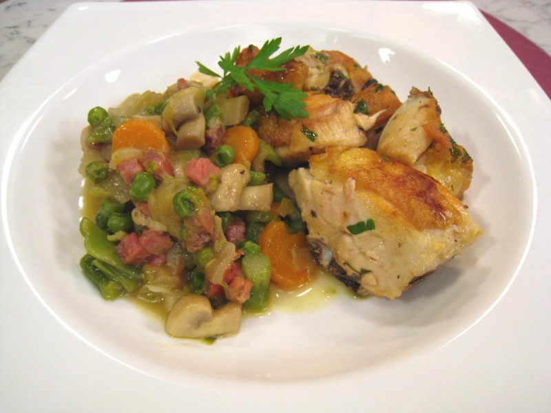 PROCESO COCINA: Para la Menestra: picar la cebolla y comenzar a rehogarla en una cacerola con 4 cucharadas de virgen extra y el jamón cortado en taquitos. Agregar una hoja de laurel, 2 dientes de ajo, el blanco de los puerros y las zanahorias cortados en rodajas. Finalmente incorporamos los guisantes, los espárragos verdes, las judías cortadas en tiras y los champiñones cortados en cuartos. Dejamos cocinar 10 minutos a fuego medio. Incorporar entonces 2 vasos de caldo de ave. Echar media cucharada de comino molido y salpimentar un poco. Mantendremos al fuego unos 20 minutos aproximadamente; hasta que el caldo haya prácticamente desaparecido. Para el pollo: En una cacerola con no mucho aceite de oliva virgen extra, freír 8 dientes de ajo, con piel y golpeados, y retirarlos. En ese mismo aceite añadir el pollo troceado y salpimentarlo. Y dejamos que se dore bien…Una vez dorado, añadimos los dientes de ajo que teníamos reservados, el zumo de 1 limón, el vino blanco y una hoja de laurel. Dejamos reducir el vino y finalmente espolvorear el pollo con perejil picado.