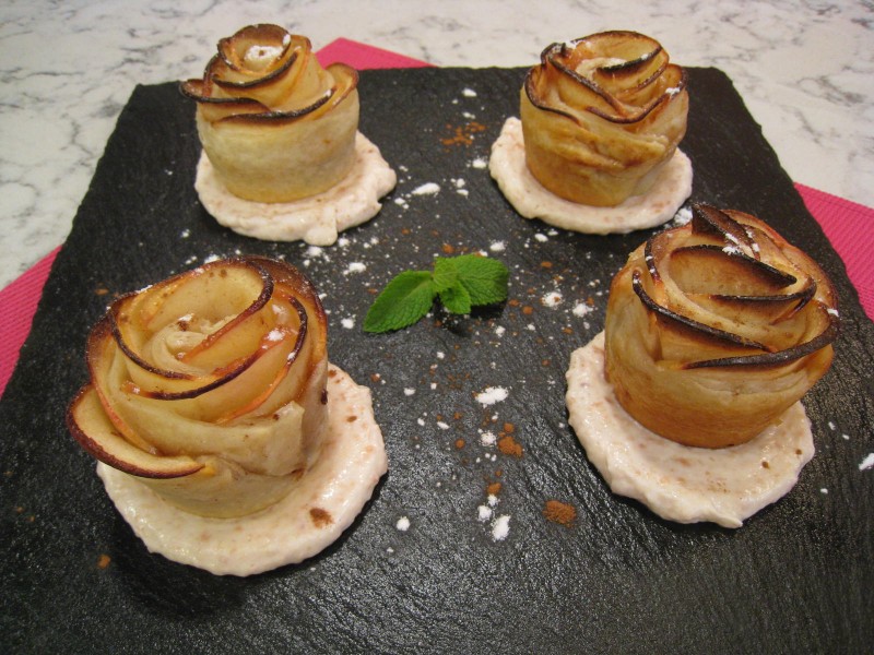 PROCESO COCINA: Verter en un cuenco 2 vasos de agua y el zumo de 2 limones. Lavar bien las manzanas, secarlas y cortarlas a la mitad. Retirar el corazón y cortar en finas láminas. Introducirlas en el cuenco con agua y limón y levarlas durante 3 minutos al microondas a máxima potencia. Mientras tanto dispondremos el dulce de membrillo en un cuenco y lo removeremos enérgicamente para hacer que tenga una textura que podamos untar; ayudándonos de unas gotas de agua si fuera necesario. Sacar las manzanas del microondas y comprobar que se pueden doblar. Escurrir y reservar. Extender la lámina de hojaldre, espolvorear con un poco de azúcar por las dos caras y aplastar ligeramente con el rodillo. Cortar en tiras de unos 4 dedos de grosor. Untar un poco de dulce de membrillo sobre estas y extender láminas de manzana, sobrepuestas unas sobre otras y dejando el lado de la piel hacia fuera. Espolvorear con canela molida. Doblar el hojaldre a la mitad, de forma que las manzanas queden atrapadas entre este. Enrollar bien, dejando el final del hojaldre sin manzana para poder sellar bien el final del rulo. Disponer cada rulo sobre papel de magdalenas y disponer en un molde de magdalenas. Hornear a 190º durante 30 minutos aproximadamente. Para la crema de queso disponer la nata, el queso crema y el dulce de membrillo en una jarra. Triturar hasta conseguir una textura untuosa. Servir la crema en la base del plato y las rosas, cuando estén cocinadas encima.