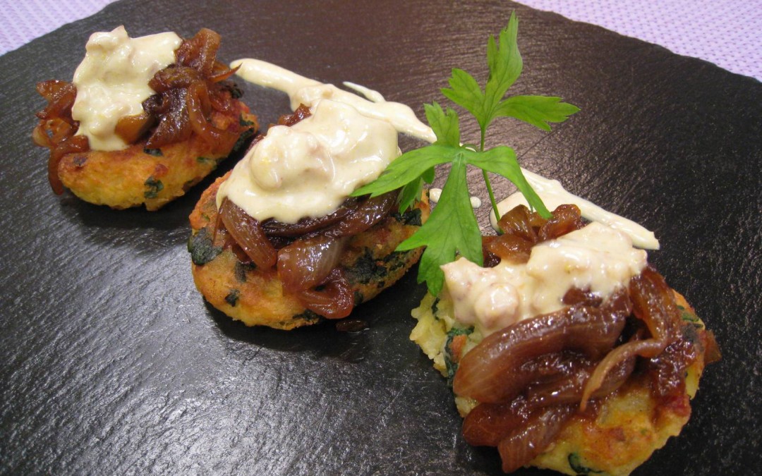 PROCESO COCINA: Disponer las patatas en una cacerola con agua y sal. Dejar hervir hasta que estén tiernas. Apartar y enfriar. Por otro lado, en una sartén caliente con un poquito de virgen extra, comenzaremos a dorar los dientes de ajo fileteados. Añadiremos entonces las espinacas y saltearemos brevemente hasta que estén cocinadas. Apartar y reservar. En la misma sartén anterior, comenzar a pochar las cebollas cortadas en juliana fina, a fuego medio y con un poco de virgen extra. Removiendo de vez en cuando para evitar que se agarre al fondo de la sartén. Pelar las patatas, picarlas con el cuchillo y disponerlas en un cuenco. Incorporar los huevos, las espinacas escurridas, el jamón picado, 3-4 cucharadas de galleta molida, sal y pimienta. Mezclar bien con las manos hasta conseguir una textura idónea para amasar. Dar forma de bola, aplastarlas un poco para que adquiera la apariencia de una tortita pequeña y comenzar a dorar en una sartén con la base cubierta de virgen extra. Cocinar por ambos lados hasta dorar y apartar sobre papel de cocina. Cuando la cebolla que teníamos pechando esté dorada, añadiremos 1/2 vaso de vino dulce, sal, pimienta y dejaremos que se evapore. Por último haremos una rápida salsa mezclando en un cuenco 1 cucharada de mostaza suave, unas gotas de vinagre y 1 cucharada de virgen extra. Remover y agregar el yogur, la miel y algunos trocitos de nueces. Mezclar bien y servir junto con la cebolla caramelizada y nuestros bocaditos de patata y jamón.