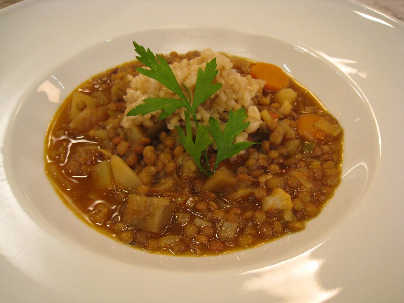 PROCESO COCINA: Comenzar a sofreír en una cacerola con 4 cucharadas de virgen extra media cebolla picada. Añadir 3 dientes de ajo fileteados, el blanco del puerro, las zanahorias, el pimiento verde y la berenjena pelada; todo bien picado en daditos. Incorporar 2 hojas de laurel y 2 clavos. Dejar sofreír. Mientras tanto rallaremos 4 tomates. Agregar a las lentejas 1 cucharada rasa de pimentón dulce y la pulpa del tomate que hemos rallado. Añadimos entonces las lentejas lavadas y escurridas. Tendremos que esperar a que el tomate comience a estar frito. Cubrir con agua e incorporar las patatas cortadas también en daditos y pequeñas porciones de coliflor. Salpimentar, incorporar un pellizco de comino molido y dejar cocer a fuego medio hasta que las lentejas estén tiernas; debiendo retirar la espuma de la superficie cuando está aparezca. Como guarnición dispondremos en una cacerola 1 vaso de arroz integral y 2 partes y 1/2 de agua fría. Añadiremos la media cebolla restante y perejil picados, sal, pimienta y un chorrito de virgen extra. Poner al fuego y cuando comience a hervir tapamos y dejamos cocer a fuego medio durante 20 minutos.