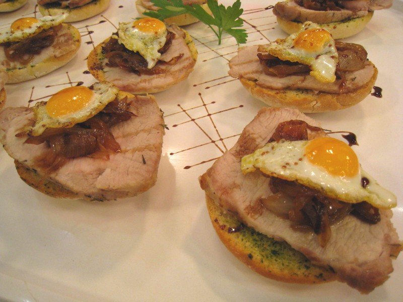 PROCESO COCINA: Salpimentar el lomo de cerdo, espolvorearlo con tomillo y dorarlo en una sartén. Disponerlo en una bandeja de horno con un chorreón de virgen extra y asarlo, a 190º C. entre 35 y 40 minutos; dándole la vuelta a la mitad del tiempo. En la misma sartén donde hemos dorado la carne comenzaremos a rehogar las cebollas cortadas en juliana fina; añadiendo un poco más de aceite si fuera necesario. Dejaremos que se cocinen a fuego medio hasta que hayan cogido color sin llegar a quemarse. Hacer una “picada” disponiendo en una jarra un buen manojo de hojas de perejil fresco, 1 diente de ajo y un chorreón de aceite de oliva virgen extra. Triturar bien y reservar. Cortar el pan a la mitad y repartirlas sobre la fuente de horno cubierta con papel vegetal. Pintar las rebanadas con un poco de “picada” e introducir en el horno hasta que comiencen a dorarse. Retirar la cebolla que teníamos caramelizando al fuego y mezclar con un poco de vinagre balsámico. Reservar para el emplatado. Solo nos restará sacar el lomo asado del horno, dejarlo reposar unos minutos y cortarlo en finas lonchas; Pudiendo servir este canapé caliente, templado o frío. Untar cada rebanada de pan con un poco de mermelada. Disponer el filete de lomo encima, un poco de cebolla caramelizada y terminar con un huevo frito de codorniz encima. Opcionalmente podremos decorar con unos trazos de vinagre balsámico por encima.