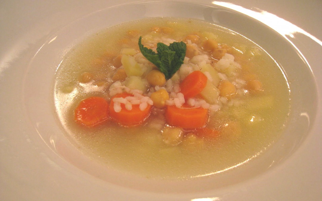 Lavar bien el tocino salado bajo el grifo. Introducirlos en una olla junto con el jarrete, los muslos de pollo, el hueso blanco y el tocino fresco. Llenar la olla de agua, remover con suavidad estos ingredientes y retirar el agua. Repetiremos esta operación una vez más, para quitar impurezas al caldo. Cubrir de agua y llevar al fuego. Añadir el nabo pelado y el puerro limpio. Una vez que comience a hervir, bajamos la intensidad para que hierva suave. Agregar entonces los garbanzos que hemos tenido la víspera en remojo. Y vamos desespumando constantemente. Cocinar a fuego suave hasta que los garbanzos y la carne estén tiernas. El chorizo y la morcilla se cuecen en un cazo aparte con agua durante 30 minutos. Reservándolos para el final. Retirar y desechar el hueso, el nabo y el puerro. Mientras que la carne y los tocinos los disponemos en una bandeja con el chorizo y la morcilla. Apartar un poco de caldo de puchero con garbanzos en una cacerola, agregar el arroz, las patatas y las zanahorias; peladas y troceadas en dados. Y dejar que hierva hasta que las verduras estén tiernas. Para la guarnición haremos unas croquetas de pringá. Pasaremos las patatas cocidas por el pasapurés, añadiremos un poco de pringá desmenuzada o picada junto los dientes de ajo y unas hojas de hierbabuena; también picadas. Salpimentar, agregar 1 huevo, mezclar bien y dar forma de croquetas con las manos. Pasar por huevo batido, pan rallado y freír en aceite de oliva virgen extra bien caliente. Apartar sobre papel de cocina para que escurra.