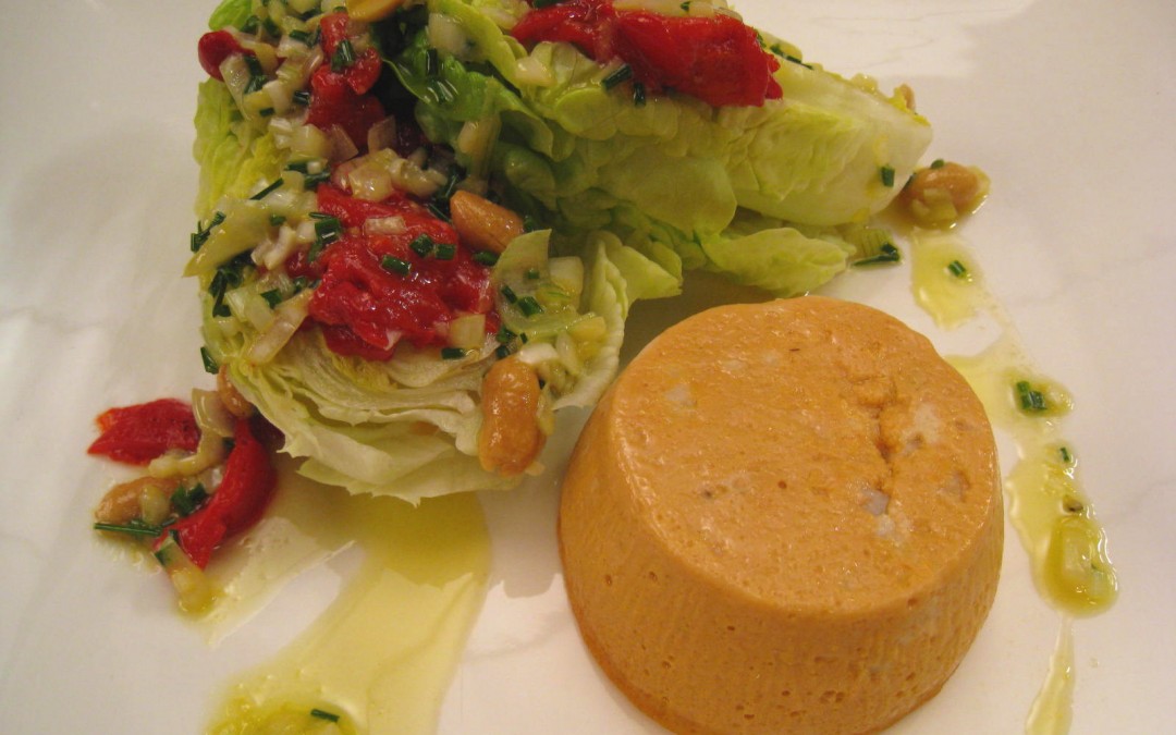 Para el flan de atún; pelar las gambas y dorar las cáscaras en una sartén con un chorro generoso de aceite de oliva virgen extra. Apartar y desechar. En ese mismo aceite cocinaremos el blanco del puerro y el diente de ajo picado. Flambear con el brandy, dejar que se apague la llama y agregar la nata. Hervir un par de minutos y apartar en una jarra. Incorporar en la jarra el atún bien escurrido, 3 pimientos de piquillo y triturar bien. Disponer en un cuenco y agregar los huevos batidos, las gambas picadas, salpimentar, mezclar y disponer en flaneras engrasadas con aceite. Hornear a 150º C., al baño María, durante unos 30 minutos aproximadamente, comprobando el punto de cocción con un palo brocheta. Para la vinagreta picar la cebolleta e introducirla en un bote de cristal. Agregar los cacahuetes troceados ligeramente, el cebollino picado, media cucharadita de mostaza, 4 6 cucharadas de aceite de oliva virgen extra, 2 de vinagre, sal y pimienta. Tapar, agitar bien y reservar en la nevera. Limpiar los cogollos, lavarlos bien y escurrirlos. Cortarlos a la mitad y disponerlos en la fuente donde vayamos a servir, colocando encima los pimientos del piquillo cortados en tiras.