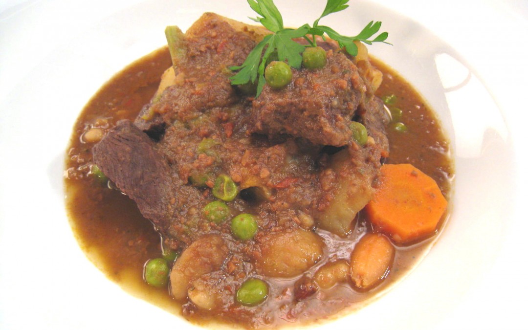 Cuando la carne este tierna, añadir los corazones de las alcachofas cortados en ¼, las patatas cortadas en cachelos, rodajas generosas de zanahoria, los guisantes y el resto de las almendras. Probar de sal y dejar cocinar hasta que las patatas estén en su punto.