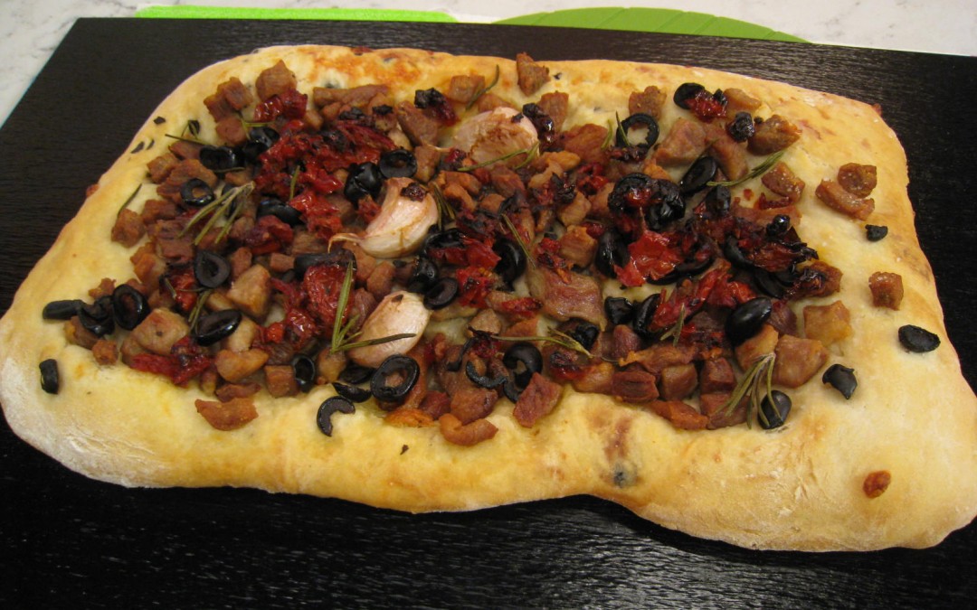 - Presionar la masa de forma suave con las yemas de los dedos y repartir por encima los chicharrones escurridos, las aceitunas cortadas en rodajas, el tomate seco escurrido y picado, algunas hojas de romero, sal y pintar con aceite de oliva virgen extra.