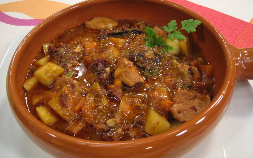 • Devolver la carne reservada a la cacerola y disponer en el mortero 1 cucharadita de sal. Agregar 1 cucharada rasante de pimentón dulce, 1 clavo de olor, ½ cucharadita de comino y la rebanada de pan reservada. Majar bien, desleír con el vino tinto y verter en la cacerola. Dejamos reducir el vino brevemente al fuego, cubrimos con agua y dejamos cocer a fuego medio hasta que la carne esté tierna.