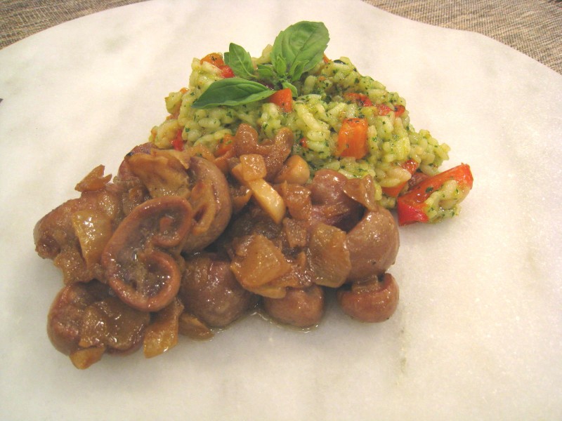 • Justo antes de servir añadiremos sobre este 4 cucharadas de pesto y mezclaremos bien. Serviremos entonces el arroz con los riñones al Jerez.