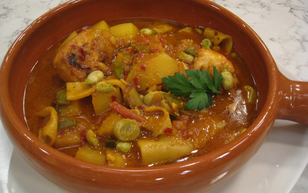 - Incorporar las habas desgranadas y verter el vino sobre el sofrito. Mientras se avalora el alcohol trituraremos los pimientos choriceros que tenemos en la cacerola junto con las almendras fritas y un poco de agua. Agregar el “majao” a la cacerola y cubrir con agua. Añadir entonces las patatas cortadas en pequeños trozos y dejar cocinar hasta que la patata esté tierna.