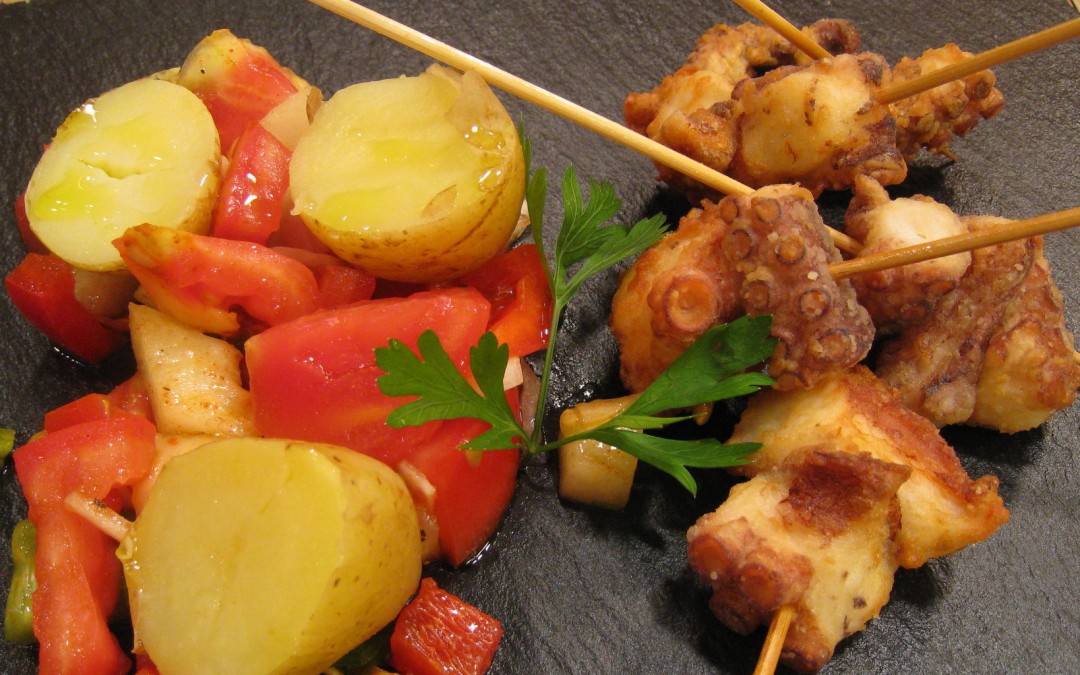 • Por otro lado, cortar el pulpo en trozos no muy grandes, hacer con el brochetas, pasarlas por harina de freír y dorarlas brevemente en una sartén con virgen extra bien caliente, rectificando de sal si fuera necesario.