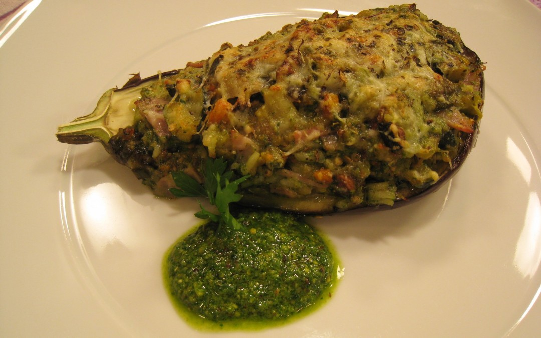 - Disponer las berenjenas sobre la placa de horno cubierta con papel vegetal. Rellenarlas con cuidado, rallar queso por encima y espolvorear con un poco de orégano.