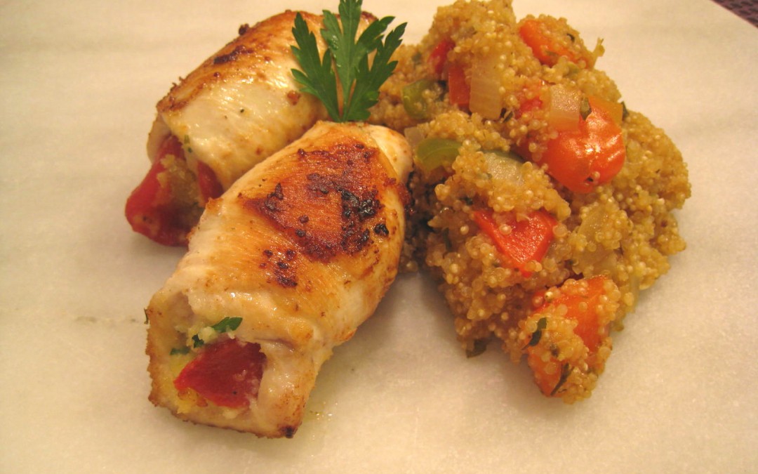 - Mientras se termina de cocer la quinoa, cocinaremos en una sartén con 3 cucharadas de virgen extra los rulos de pechuga rellenos.