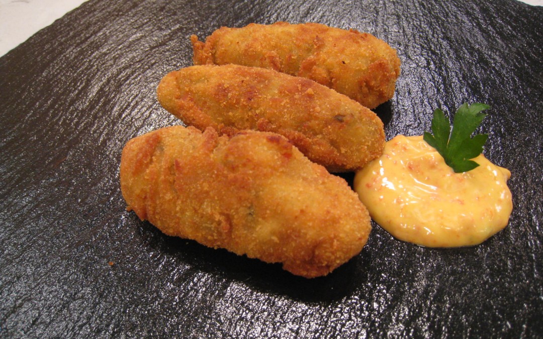- Pasar las croquetas por harina, las claras batidas y pan rallado. Freírlas en aceite de oliva virgen extra caliente hasta que se doren. Apartar sobre papel de cocina para que escurran el exceso de aceite.