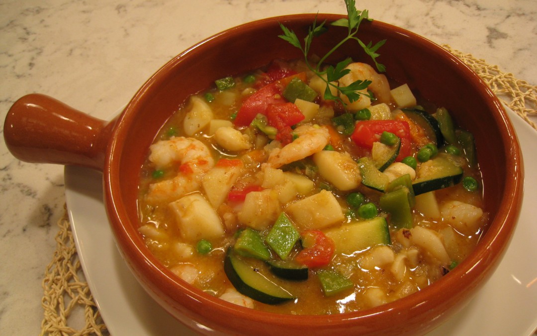 - Incorporar la patata pelada y cortada en trozos generosos, el calabacín y la zanahoriacortados en medias rodajas. Cocinar unos minutos y añadir el tomate picado y una hoja de laurel. Verter la copa de vino blanco, dejar hervir un momento para que evapore el alcohol y cubrir solo con el agua precisa. Dejar que comience a hervir.