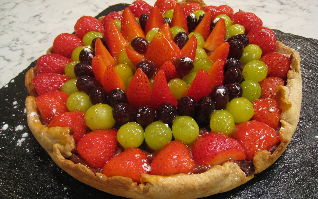 • Sacar la masa del horno, dejar enfriar brevemente, verter sobre ella la crema pastelera y repartir las uvas y las fresas por encima.
