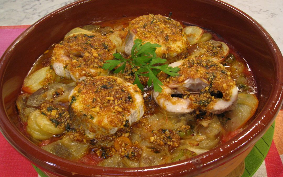 - Extender una fina capa de tomate frito y un poco de virgen extra en la base de las cazuelas de barro. Repartir las patatas con verduras sobre estas y colocar encima las rodajas de merluza. Salar ligeramente el pescado y llevar al horno, precalentado a 180ºC, durante 15 minutos aprox.