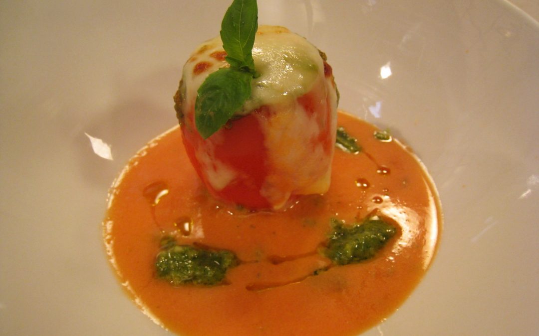 - Sacar los tomates vacíos que tenemos en el frío. Rellenarlos con trozos de queso intercalados con un poco de pesto. Echar un chorrito de virgen extra por encima y hornear durante unos 15 minutos a 185º C.