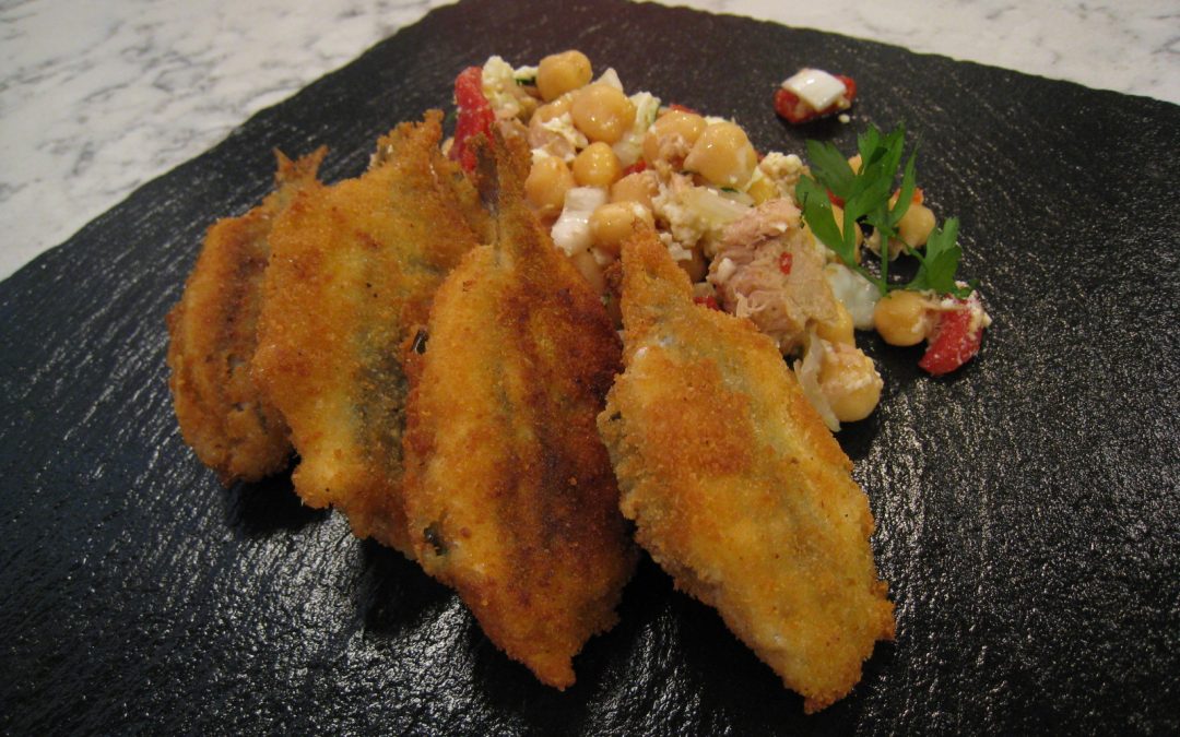- A los boquerones solo nos resta pasarlos por harina, huevo batido y pan rallado. Freírlos en virgen extra caliente hasta dorar y apartar sobre papel de cocina para que escurran.