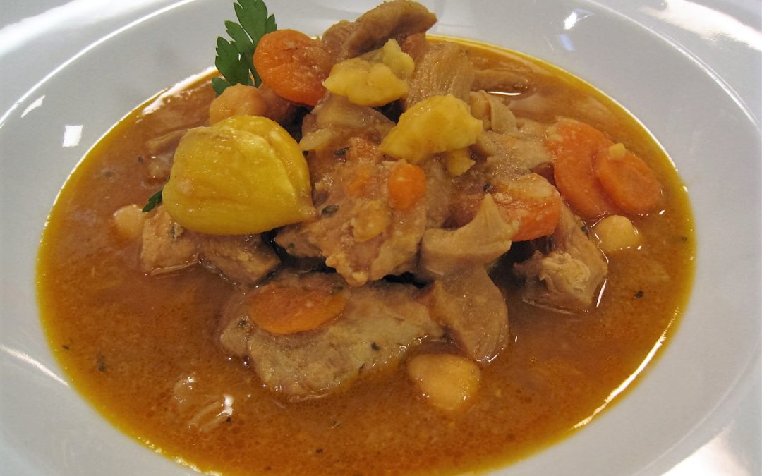 - Pelar las castañas y agregarlas al guiso junto con los garbanzos que hemos tenido en remojo de agua caliente en la víspera. Echar un pellizco de sal al agua y dejar cocer a fuego medio hasta que los garbanzos y la carne estén tiernos.