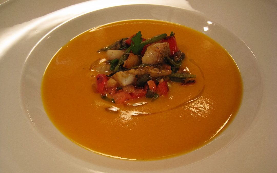 - Retirar la corteza y las semillas de la calabaza. Comenzar a rehogarla en aceite de oliva virgen extra con un par de dientes de ajo y el blanco de 1 puerro troceado. Incorporar las patatas peladas y troceadas. Agregar media cucharada de pimentón y cubrir con agua. Salpimentar y dejar cocer hasta que la patata y la calabaza estén tiernas.