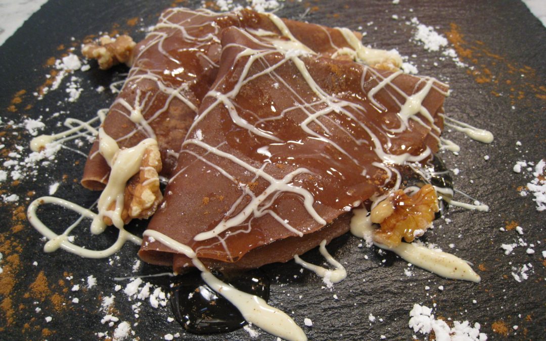 - Para la masa de los crepes; Introducir en una jarra la harina, la leche, 2 huevos, un pellizquito de sal, 2 cucharadas de azúcar, 3 cucharadas de cacao en polvo, un chorrito de virgen extra y terminar de batir. Añadir un poco de virgen extra a una sartén caliente e incorporar un cacito sopero de masa de crepes. Extender rápidamente por toda la superficie y, cuando le salgan pompitas, le damos la vuelta. Dejar cocinar brevemente y apartar. Para el relleno de los crepes comenzaremos a derretir los 125 g. de mantequilla en una cazo. Le añadiremos 100 g. de azúcar moreno y una pizca de canela molida. Dejaremos que se mezcle bien. Mientras tanto iremos pelando los plátanos, cortándolos en rodajas gruesas e incorporándolos a la cacerola junto con las nueces peladas. Verter la nata, mezclar bien y dejar cocinar unos minutos hasta que tengamos el espesor deseado. Retirar entonces del calor. Para decorar y terminar los crepes, pondremos un poco de chocolate blanco a derretir al baño María. Rellenar los crepes con las rodajas de plátano y nueces; dándole la forma deseada. Triturar bien la jalea de vino, ayudándonos con agua si fuera necesario, para que quede más fina y podamos salsera el plato a la hora de servir. Solo nos restará presentar los crepes en un plato con el chocolate blanco por encima y espolvorear con nueces peladas y algunas hojas de menta.