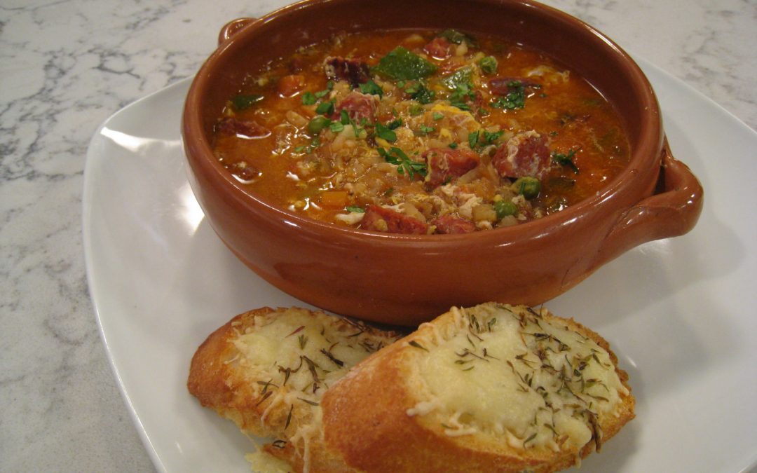 • En el aceite anterior comenzaremos a dorar los dientes de ajo y añadiremos la cebolla, la zanahoria, el pimiento verde picados y el chorizo picados. Dejaremos cocinar algunos minutos y agregaremos los tomates pelados y picados. Dejándolos sofreír 5 minutos a fuego medio. Cubrir con el caldo e incorporar a la cacerola los guisantes y las judías verdes limpias y troceadas junto con un puñadito de arroz. Probar de sal. Dejamos cocer 15 minutos a fuego medio. Como guarnición sencilla y rápida de la sopa podemos cortar rebanadas del pan sobrante, espolvorear con queso rallado y tomillo seco e introducir en el horno precalentado a 200º hasta que el queso se derrita. Finalmente agregar las rebanadas de pan frito en la sopa. Cocinar entre 2 y 3 minutos y añadir los huevos enteros, removiendo enérgicamente para mezclar y dar la consistencia definitiva a la sopa campera. Probar de sal y servir.