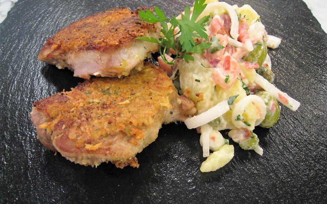 Para los solomillos empanados, lo primero será limpiar la carne y cortarla en medallones generosos. Los cuales cocinaremos por ambos lados en una sartén con virgen extra bien caliente. Dejándolos un poco crudos por el centro. Mezclar en un cuenco 5 cucharadas de pan rallado, 5 cucharadas de queso rallado, 5 cucharadas de virgen extra, orégano y salpimentar. Remover bien la mezcla. Pintar cada medallón de solomillo con mostaza suave y empanarlos en la mezcla anterior. Solo nos faltará dorarlos por ambas caras en una sartén con un poquito de virgen extra caliente. Servir los solomillos empanados junto con la ensalada fría de patatas y aceitunas.