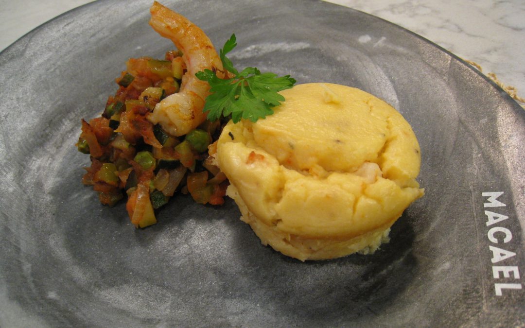 Comenzaremos pelando las dos patatas, troceándolas y sumergiéndolas en agua hirviendo con sal y una rama de romero. Las dejaremos cocer hasta que estén tiernas. Por otro lado, doraremos las cáscaras de los langostinos en una sartén con un buen chorreón de virgen extra. Una vez que estén doradas las retiraremos y en ese mismo aceite comenzaremos a dorar 5 dientes de ajo picados. Cuando estén cogiendo color, apagaremos el fuego y agregaremos los cuerpos de los langostinos troceados en pequeñas porciones con el cuchillo. Mezclar y reservar. Podemos dejar algunos langostinos enteros en la sartén para decorar al final. Escurrir las patatas cocidas y pasarlas por el pasapurés. Añadir una nuez de mantequilla, 2 huevos, la nata, unas 4 cucharadas de queso rallado y los langostinos al ajillo. Salpimentar, rellenar moldes individuales engrasados con aceite, compactar bien y cocinar unos 15 minutos en el horno precalentado a 180º. Para el asadillo de verduras comenzar a rehogar en una sartén con virgen extra la cebolla, 2 dientes de ajo, 1 pimiento verde y 1 calabacín. Sofreír unos minutos a fuego medio y agregar los tomates rallados y los guisantes. Salpimentar. Dejaremos cocinar hasta que el tomate haya evaporado casi toda el agua.