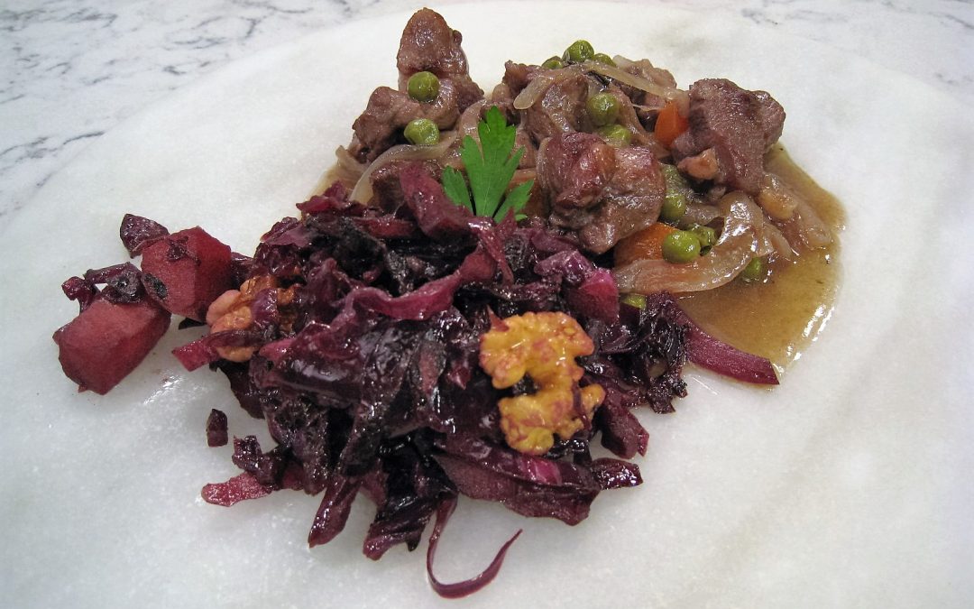 Salpimentar la carne de cordero y enharinarla ligeramente. Comenzar a dorarla en una cacerola con 4 cucharadas generosas de virgen extra. Una vez que se haya dorado agregar las cebollas cortadas en juliana, los ajos laminados y las zanahorias peladas y cortadas en medias rodajas. Añadir 2 hojas de laurel y 2 clavos. Dejamos sofreír unos minutos. Verter entonces el vino tinto, dejar que evapore el alcohol y cubrir con agua. Echar los guisantes, un pellizco de sal, pimienta y dejar cocer a fuego suave durante 1 hora aproximadamente. Debiendo quedar la carne tierna y muy poco caldo. Cortar la lombarda en finas tiras y cocinar a fuego alto durante 5 minutos, en una cacerola con virgen extra. Removiendo de forma constante para evitar que se agarre. Salpimentar y agregar entonces la manzana troceada en pequeños trozos, el salchichón cortado en dados muy pequeños, 2 cucharadas de azúcar, otras 2 de vinagre y verter el vaso de vino tinto. Dejaremos cocer a fuego suave durante 30 minutos, moviendo de vez en cuando. Justo antes de servir añadiremos algunas nueces peladas a la lombarda. Servir el ragú acompañado de la lombarda.