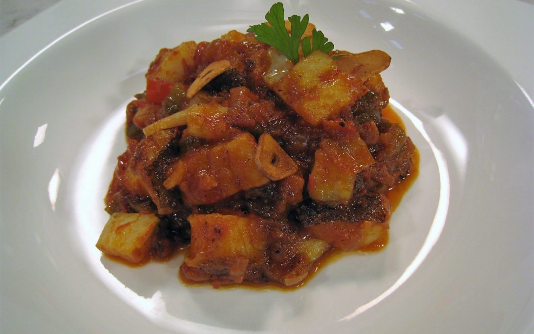 Poner los pimientos choriceros, sin tallos ni semillas, en remojo con agua tibia con 1 hora de antelación. Filetear los dientes de ajo y dorarlos en una cacerola con un chorreón generoso de virgen extra. Apartarlos con la espumadera sobre papel de cocina y reservarlos. Picar el bacón y la cebolla en dados pequeños y comenzar a rehogarla en el aceite anterior. Agregar un par de hojas de laurel junto con los pimientos también troceados en pequeños dados. Dejar sofreír 15 minutos a fuego medio. Disponer los pimientos choriceros escurridos en una jarra con los tomates troceados. Triturar con la batidora, verter sobre las verduras que tenemos en la cacerola y salpimentar. Dejaremos cocinar a fuego medio hasta que el tomate esté frito; tapando la cacerola si el tomate salpicara mucho. Por otro lado pelaremos las patatas, las lavaremos y las rallaremos. Una vez ralladas las apretaremos bien con las manos y el escurridor para que suelten el exceso de agua. Salpimentar las patatas ralladas y escurridas, mezclarlas bien con perejil picado y disponer pequeñas porciones compactas y finas sobre una sartén con virgen extra. Cocinar por ambos lados hasta dorar. Una vez que el tomate esté bien frito, añadiremos el bacalao cortado en dados y mezclaremos bien. Mantendremos al fuego 1 minuto y apagaremos para que el bacalao se cocine sin pasarse de cocción. Presentar el bacalao con ajos fritos por encima y un crujiente de patata.